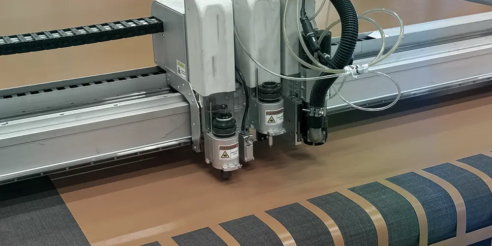 For precise automated cutting of laminated textiles and milling of materials up to 10 mm thick, we use an IECHO tabletop cutting and milling plotter.